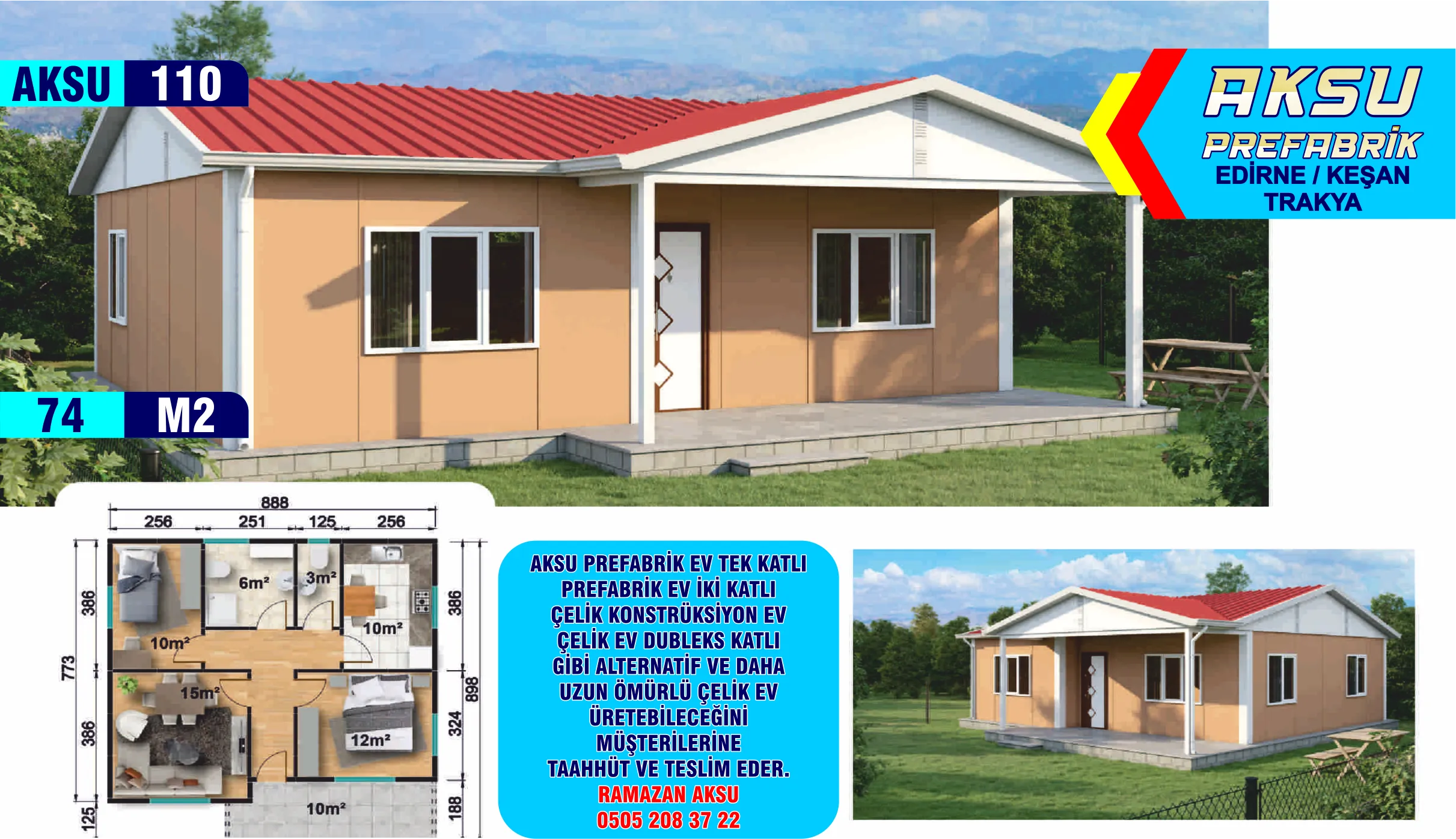 Tek Katlı Ekonomik Prefabrik Evler Hızlı, Güvenli, Kalıcı, Size Özel Tasarımlar. AKSU Prefabrik & Hafif Çelik olarak, ekonomik prefabrik ev çözümleri ile konforu ve kaliteyi herkesin erişebileceği hale getiriyoruz. Tek katlı ekonomik prefabrik evlerimiz, modern yaşamın ihtiyaçlarını karşılayan, dayanıklı ve uygun maliyetli yapılar sunar. Neden Ekonomik Prefabrik Evler?